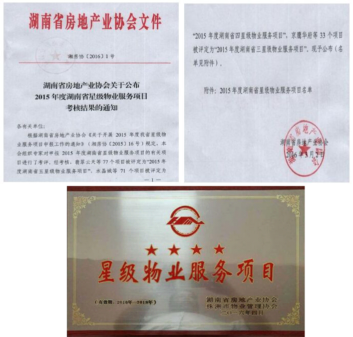 熱烈慶祝我公司在管創(chuàng)信·中央皇庭項目 榮獲“2015年度湖南省四星級物業(yè)服務項目”稱號