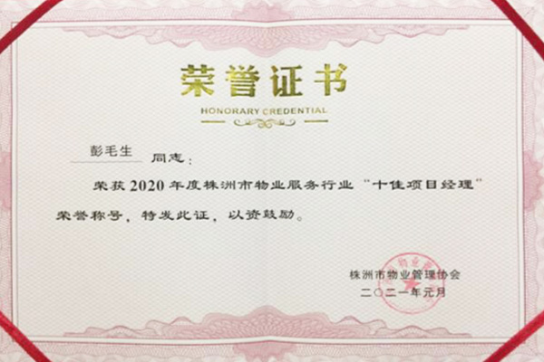 2021年3月26日,株洲市物業(yè)管理協(xié)會(huì)2020年度會(huì)議在株洲市萬(wàn)豪酒店舉行,會(huì)上我公司被授予“2020年度榜樣企業(yè)”、“2020年度優(yōu)秀企業(yè)”,董事長(zhǎng)文虎龍被授予“2020年度榜樣人物”,公司服務(wù)項(xiàng)目金山小區(qū)被授予“株洲市三星級(jí)物業(yè)服務(wù)項(xiàng)目”,公司管理人員彭毛生被授予“十佳項(xiàng)目經(jīng)理”等光榮稱號(hào)。